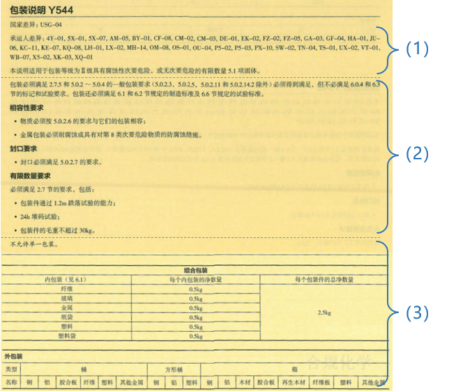 和TDG法规一样,不允许使用单一包装,使用组合包装;包装件毛重不得超过30Kg。但是每个包件的净数量需要按照“Y”包装说明要求包装。