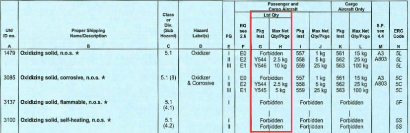 以UN1479“氧化性固体,未另作规定的”为例(见图3),其不同的包装类别对应不同的LQ数量。包装类别I类对应的G/H栏为“Forbidden”,说明此类物质不能通过LQ的方式运输。包装类别Ⅱ/Ⅲ类则对应包装说明Y544/Y546,包装件最大净数量为2.5kg/10kg(这个数据是指单个包件,而非单个内包装)。