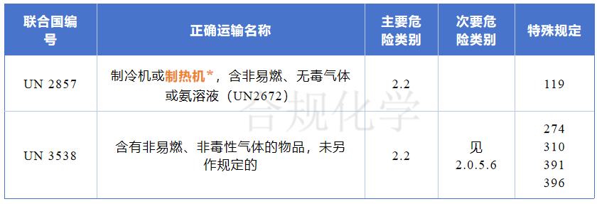这两个UN条目最值得关注的区别是UN2857有特殊规定119,而UN3538条目没有此特殊规定: