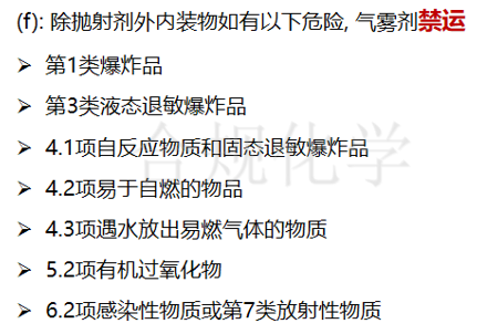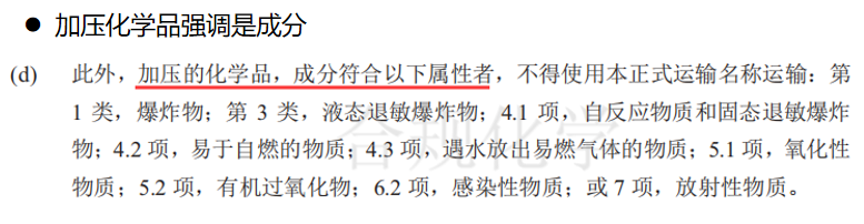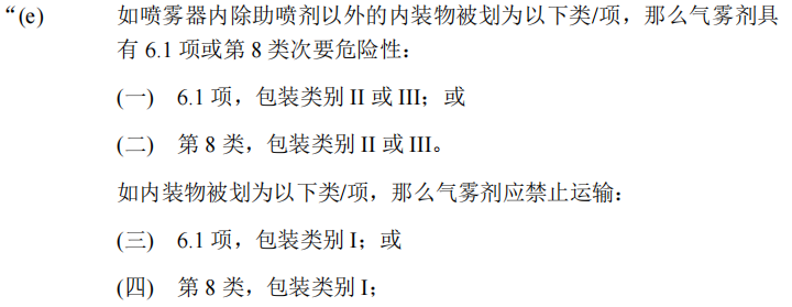 根据此条款,气雾剂若内装物含有第6.1项急性毒性I类包装或第8类腐蚀I类包装的成分,则禁止运输。