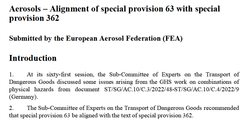 2025年9月15日,联合国TDG法规第24修订版正式发布,欧洲气雾剂协会(FEA)提交提案对气雾剂产品的危险货物运输分类特殊规定进行了重要调整,旨在规范气雾剂产品运输分类要求,确保其运输安全。