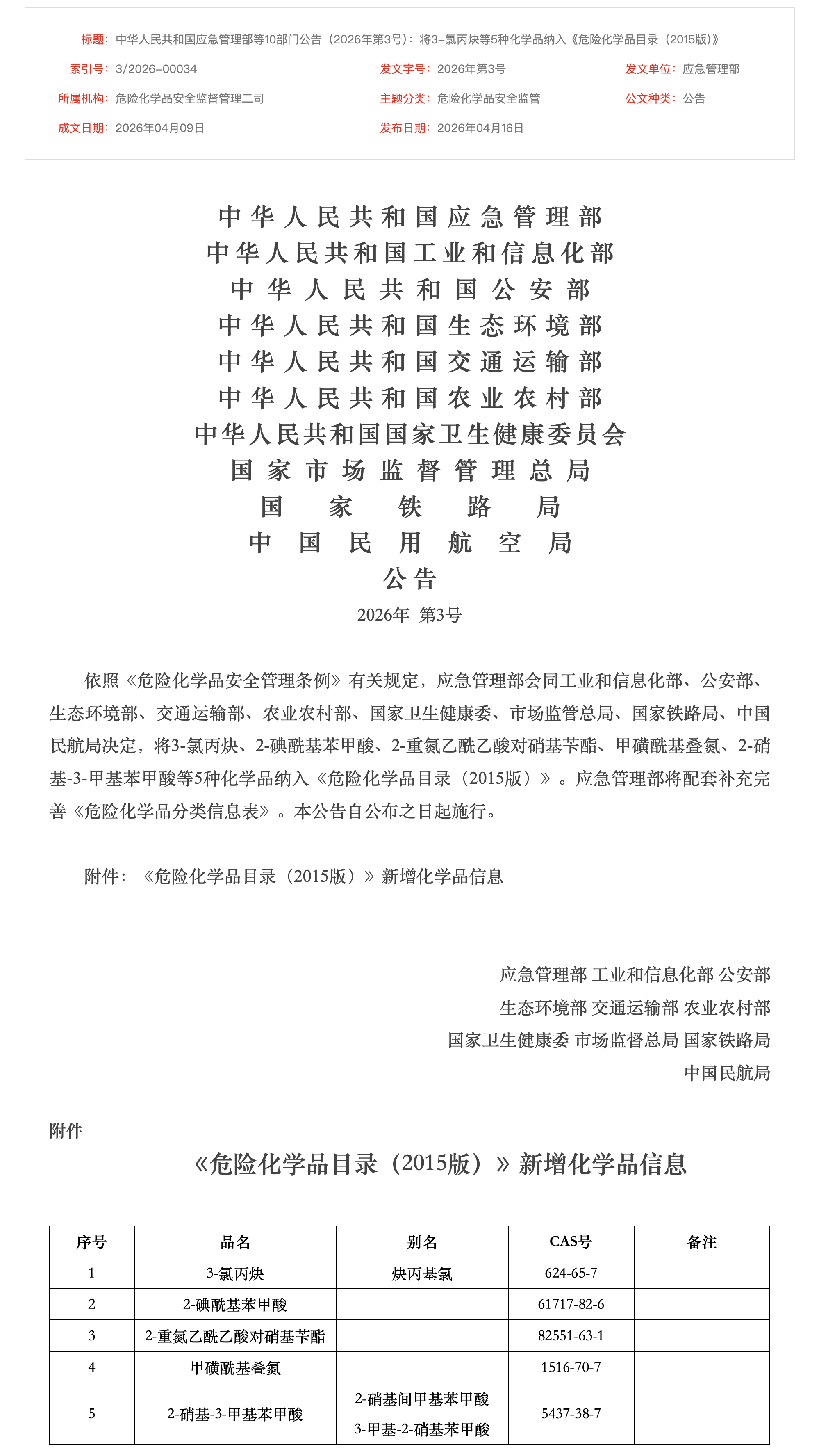 2026年4月16日,应急管理部等10部门发布2026年第3号公告,正式将以下5种化学品纳入《危险化学品目录(2015版)》,公告自发布之日起即时生效: