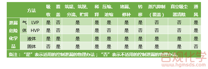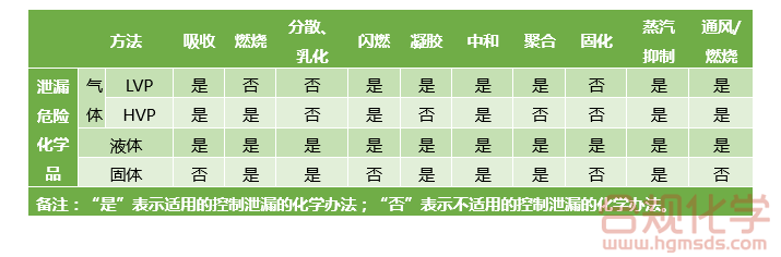 其中物理方法主要是几种缩小溢出、泄漏等事件范围的方法和程序,具体参见表5;化学方法则指的是用化学药剂处理泄漏出来的危险化学品,具体参见表6。