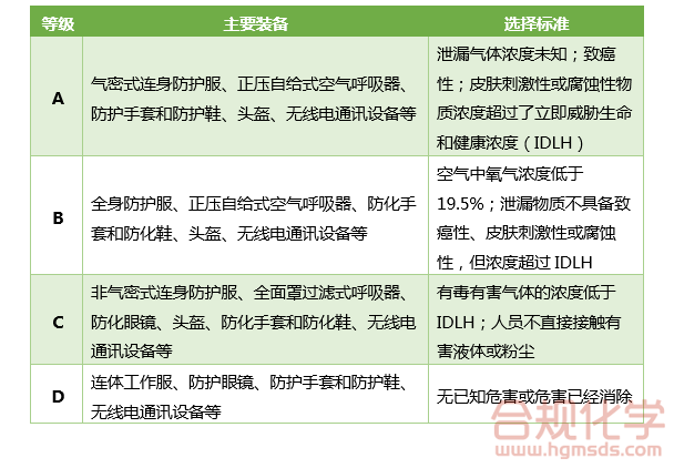 我国目前关于个体防护装备配置的要求主要参考的是GB/T 11651-2008。而针对化学品泄漏处置环节,美国NFPA 471标准则对个体防护装备的选择给出了明确指导。具体如表4所示。