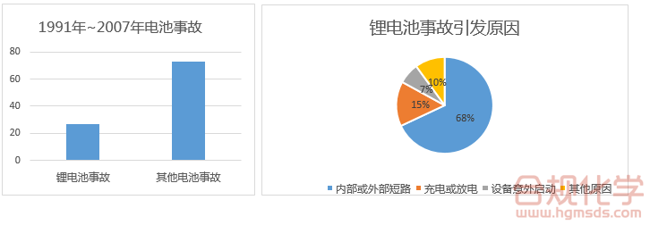 据美国FAA 的相关统计数据表明:1991~2007年间所发生的电池事故中,27%是锂电池事故,而这些事故中,68%是由于内部或外部短路造成,15%是由于充电或放电造成,7%由于设备意外启动,10%为其他原因。由此进一步证明,各种因素直接或间接造成的电池内、外部短路,是导致锂电池安全事故发生的主要原因。