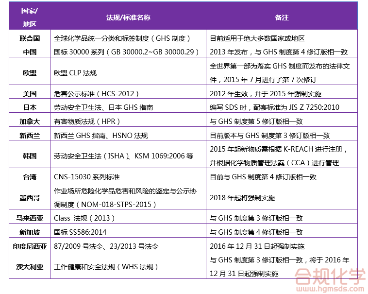 在执行联合国GHS制度时,各国或地区都采取“积木式”原则,选择性采纳GHS制度中的危险种类和类别,这也导致了全球各地关于危险化学品分类的尺度并不完全一致,没有实现联合国的初衷——全球危险化学品危险性的统一分类。因此,我们首先为大家简单梳理一下全球主要国家执行联合国GHS的法规文件,具体如表1所示。