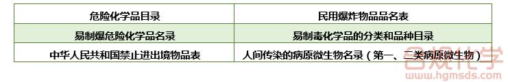 同时,对于旧目录中一直备受争议的“其他禁止寄递的物品”(第十四条)在新目录中(第十九条)也有了更为明确的说明。新规定指出:除了法律、行政法规、国务院和国务院有关部门规定禁止寄递的其他物品外,列入我国几个重点监管目录(名录)的危险化学品均属于新目录中的“其他禁寄物品”,如表1所示。