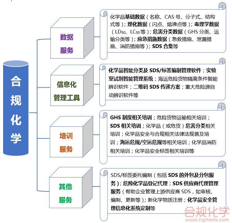 就目前已发布的新政策而言,不管是相关监管部门还是企业都面临重大挑战,技术难点更是多如牛毛。合规化学秉承“为化学品合规与安全提供技术便利”的理念,愿意为中国化工产业的健康持续发展添砖加瓦。面对这一系列新的法规政策,合规化学可以为广大用户针对性提供以下帮助,如图1所示。