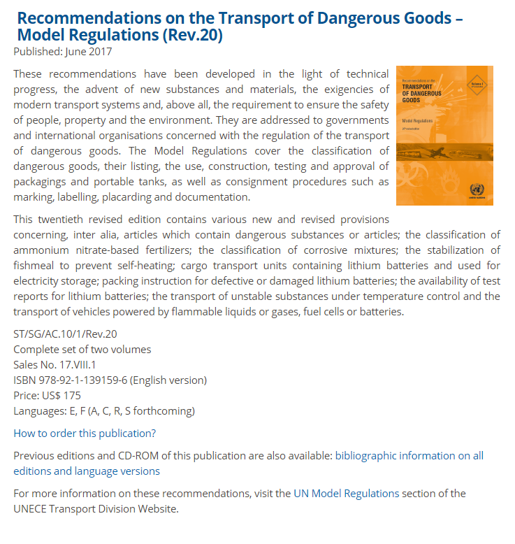 联合国《关于危险货物运输的建议书 规章范本》(Recommendations on the Transport Of Dangerous Goods Model Regulations,简称TDG或橘皮书),该法规发布于1956年,一般每两年修订一次, 近期,联合国欧洲经济委员会(欧洲经委会,UNECE)官网已正式发布TDG第二十修订版。