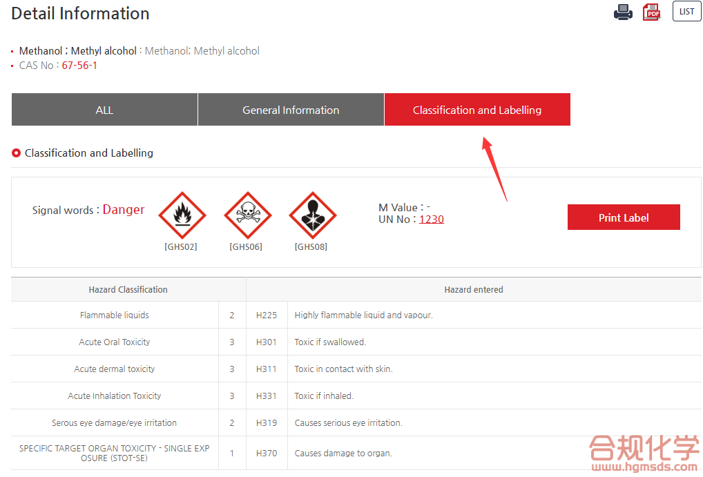 如图3所示,点击“Classification and Labelling”即可查看甲醇的GHS分类结果,GHS标签的信号词和象形图,以及危险货物分类结果。