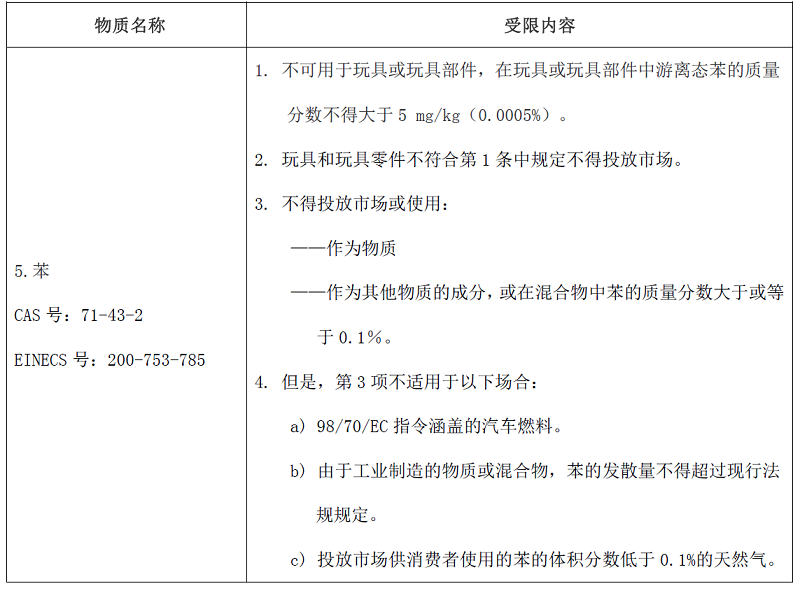 (1)REACH法规附件XVII第5条第3段规定:如果苯作为物质,或者作为其他物质的成分,或在混合物中的质量分数大于或等于0.1%,那么苯不得投放市场或使用;