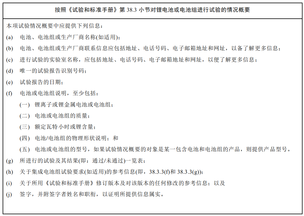 根据TDG法规第2.9.49(g)条规定,2003年6月30日以后生产的锂电池,生产商和下游分销商应该提供电池UN38.3的摘要(具体要求如图3所示)