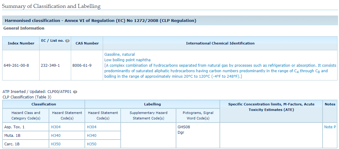 例如企业需要编制一款常见溶剂“汽油”的SDS(天然汽油:CAS号8006-61-9),检索CLP法规附件VI统一分类清单,得知汽油的分类是H304吸入毒性,类别1;H340生殖细胞致突变性,类别1;H350致癌性,类别1(图1)。
