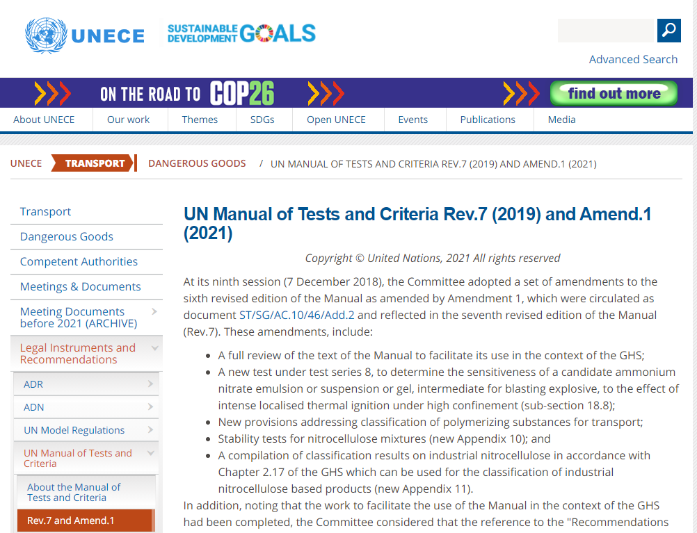 近期,联合国官网正式发布了《试验手册》第7修订版第1修正案,具体下载链接如下:
