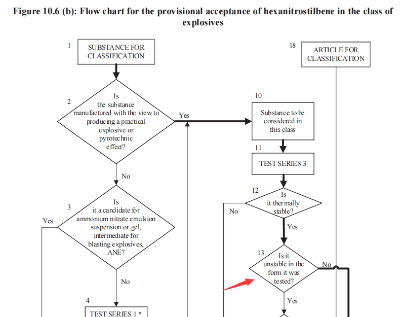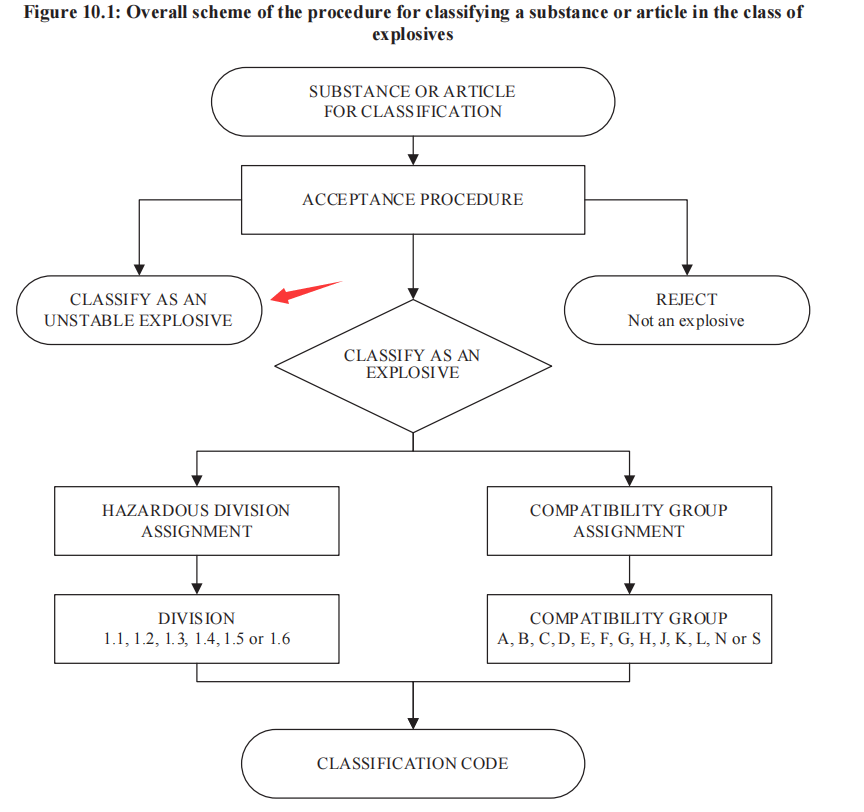 图10.1是爆炸品分类的整体流程示意图,本次修订将“CLASS AS AN UNSTABLE EXPLOSIVE”修改为“CLASS AS AN EXPLOSIVE,No division assigned”,类似修改在第13章也有。