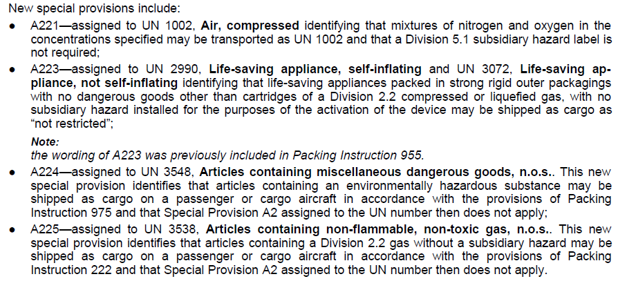 A225:适用于UN 3538,含非易燃、无毒气体的物品,n.o.s。允许含有2.2项非易燃无毒气体的物品按照包装说明222在客机或货机上运输且无需适用特殊规定A2。