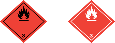 如图2所示,第3类易燃液体有两种运输标签供选择。在实际使用时,需要根据包装背景,选择对比度高的,以显得更加醒目。