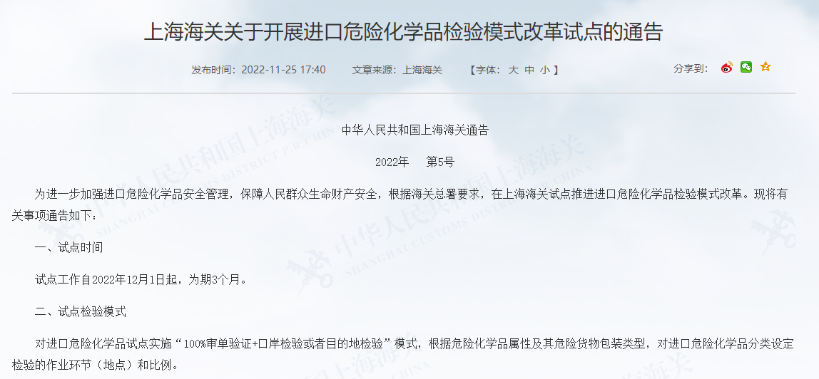 2022年11月25日上海海关发布了关于开展进口危险化学品检验模式改革试点的通告(2022年 第5号),自2022年12月1日起,对自上海浦江海关申报进口的危险化学品试点实施“100%审单验证+口岸检验或者目的地检验”模式。