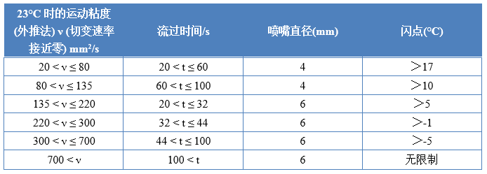 Ø 在用直径6mm喷嘴进行粘度试验中,流过时间等于或大于60s;或者40s(如果粘性物质含有不超过60%的易燃性物质)。