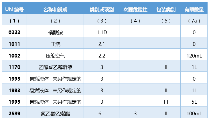 危险化学品在送检实验室进行运输危险性鉴定后,如果被鉴定为危险货物都会被分配一个4位阿拉伯数字组成的UN编号(例如1002),如果该UN编号在联合国TDG以及国际海运、空运等危险货物运输法规的《危险货物一览表》(以下简称一览表)的第7a列有限数量中所对应的具体数值不是0,则表示该危险化学品可以进行有限数量运输。