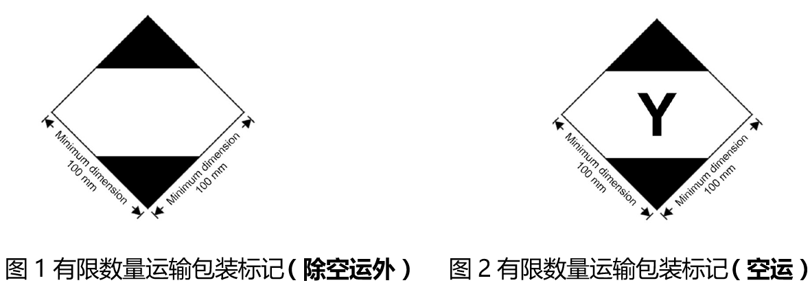 为了在运输环节,能快速识别有限数量运输的危险化学品包装件,联合国TDG等国际法规以及GB 28644.2-2012均要求在有限数量运输的包装件外表面加贴统一的标记,具体见图1和图2。