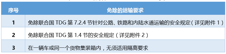 如表1所列,危险货物在满足“有限数量”规定时,可和普通货物混装,无需特殊隔离,而且免除了联合国TDG第1.4节第2条 “发货人只能将危险货物交给有适当身份的承运人”的要求,换言之以“有限数量”运输时,发货人可将货物交付给交通运输主管部门认定的有危险品运输资质的卡车公司,也可以是快递,甚至个人。
