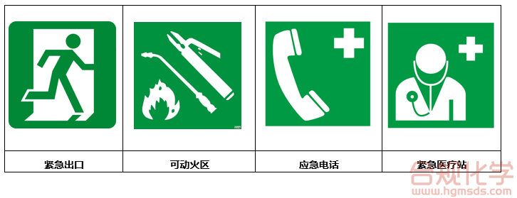 提示标志指的是向人们提供某种信息(如表明安全设施或场所等)的图形标志。它的基本型式是正方形边框,特点是绿色背景(消防设备提示标志除外,其提示标志均为红色背景),白色图形符号。常见的提示标志包括:紧急出口、避险处、应急避难场所、可动火区等等。示例如表8所示。