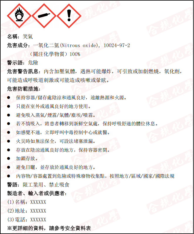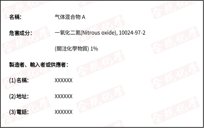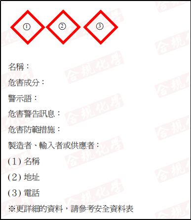 中国台湾地区GHS标签基本要素与联合国GHS制度一致,标签应包含名称、危害成分、危害图式(象形图)、警示语(信号词)、危害警告讯息、防范措施以及制造者/输入者/供应者信息。在《危害性化学品标示及通识规则》中也提供了标签范例。