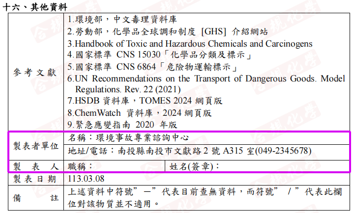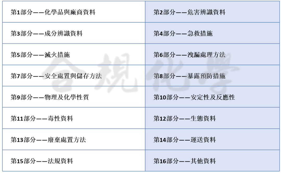 中国台湾地区安全资料表(SDS)内容包括16个部分,但是各个部分的繁体中文表述与GB/T 16483有一定的差异性,每一部分的信息要求严格按照《危害性化学品标示及通识规则》附表4。