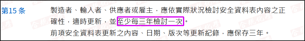 SDS有效期台湾也有特殊要求,依据《危害性化学品标示及通识规则》第十五条,制造者、输入者、供应者或雇主,应依实际状况检讨安全资料表内容的正确性,随时更新,且至少每三年检讨一次。同时,前项安全资料表更新的内容、日期、版次等更新记录,应保存三年。