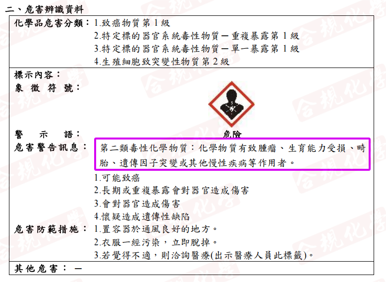 中国台湾地区化学品分类依据CNS 15030.1-CNS 15030.29,如果是毒性/关注化学物质,还需要额外标注类别。