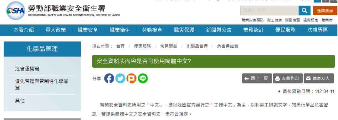 特别注意,安全资料表所用文字以中文繁体为主,必要时并辅以作业劳工所能了解之外文。