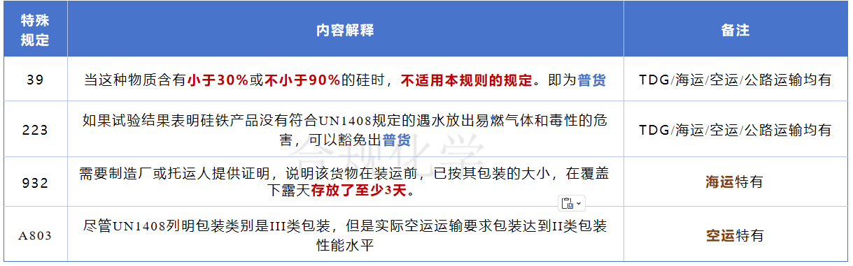 不同运输法规中有关UN1408的特殊规定具体整理如下。