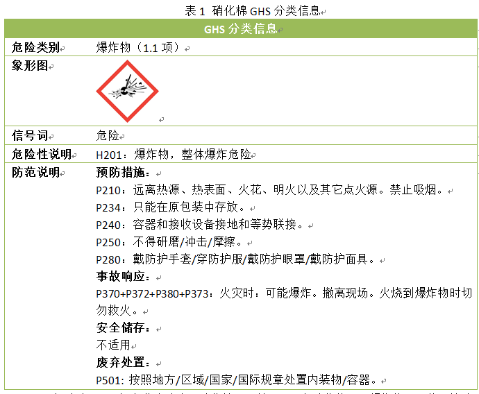 根据联合国GHS制度以及2015版危化品目录实施指南,硝化棉分为爆炸性物质,具体GHS分类信息如表1所示。