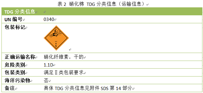 同时,根据TDG规章范本分类,硝化棉属于第1.1项危险货物,即爆炸物。具体运输分类如表2所示。