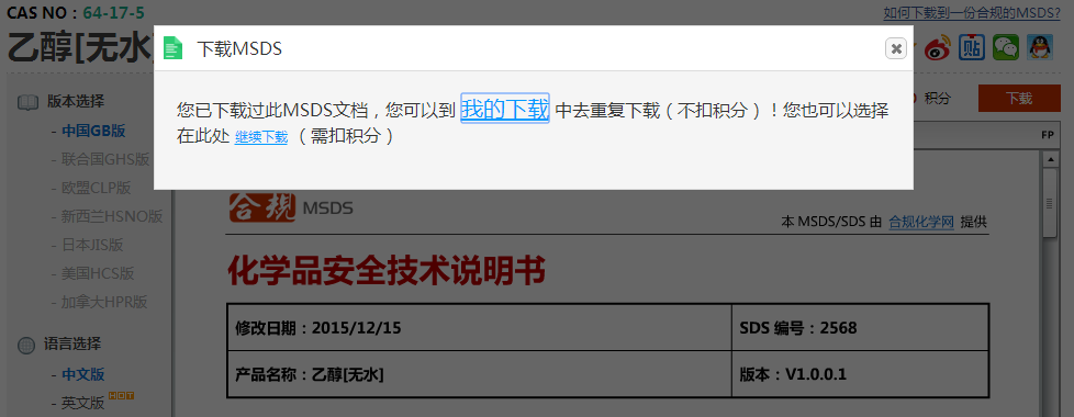 登录合规化学网“MSDS下载”页面,可通过化学品的CAS号、中文名称或英文名称进行检索,建议采用CAS号进行精确检索。根据检索结果,进入化学品MSDS报告界面,报告可选择中文版/英文版,然后点击右上角“下载”按钮,后台新增自动判别功能,如已下载过MSDS报告,再次下载会有弹窗跳出提醒,到我的下载中下载不扣除积分(见下图)。