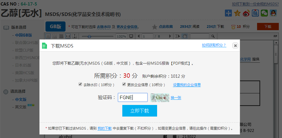 根据检索结果,进入化学品MSDS报告界面,报告可选择中文版/英文版,点击右上角“下载”按钮,根据跳出的弹窗选择是否去除水印或更改企业信息,然后输入验证码,点击立即下载,如不需更改任何信息后台下载只需一秒,不用等待!