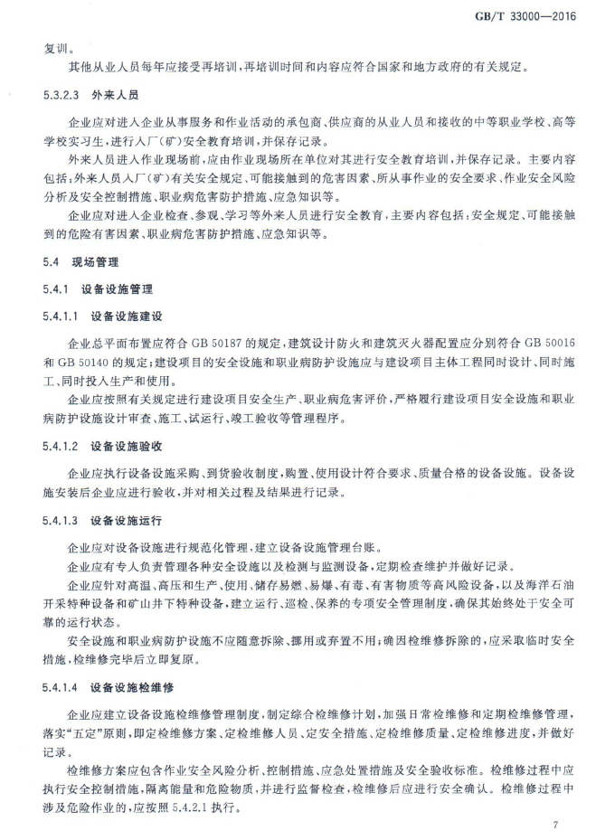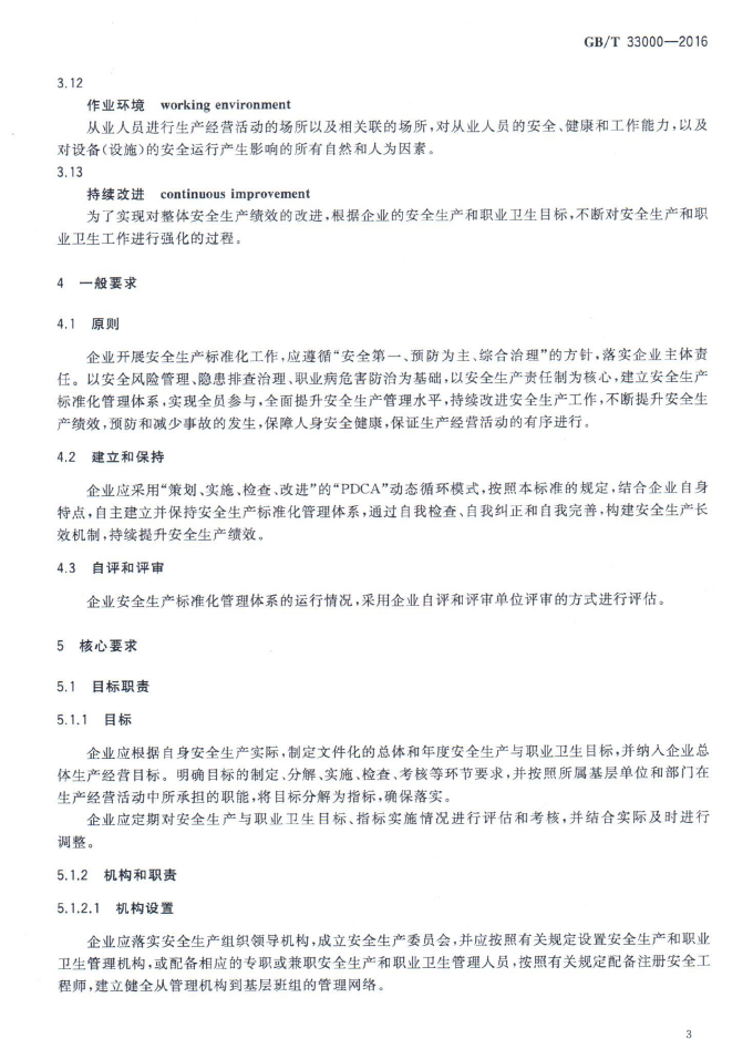 本标准规定了企业安全生产标准化管理体系建立、保持与评定的原则和一般要求,以及目标职责、制度化管理、教育培训、现场管理、安全风险管控及隐患排查治理、应急管理、事故管理和持续改进8个体系要素的核心技术要求。