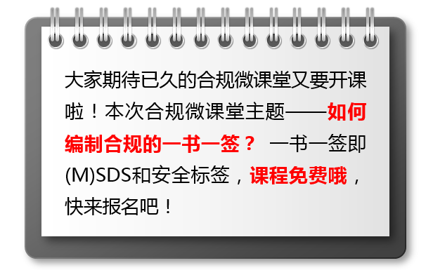 从合规角度讲,企业有义务和责任向政府/作业人员/消费者/公众传递合规的一书一签,避免因(M)SDS信息错误而导致的巨大安全隐患和法律风险。但对于企业而言,编制一份合规的报告可能要花费大量的时间和精力,常常会感到力不从心,那么编制合规的一书一签是否有什么“小窍门”?有哪些技术难点?又有哪些注意事项?欢迎参加7月19日(周三)晚上19:00举办的合规微课堂,合规化学技术专家将根据多年(M)SDS和安全标签编写经验,在“合规微课堂”中为您讲解编制一书一签的相关技术内容。课程免费,快来报名吧!