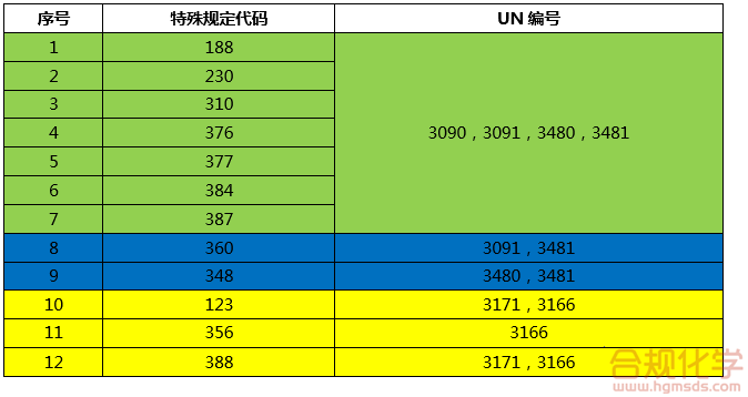 锂电池在联合国TDG法规中,属于第9类杂项危险货物,其涉及的UN编号有3090、3091等7个,与此对应的特殊规定有如下12个: