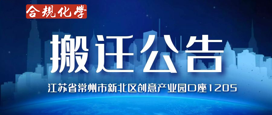 承蒙您长期以来的支持与信任,在此,合规化学全体员工谨表示由衷的感谢!随着公司规模变大,为了更好地为客户提供高质量服务,为了进一步提升公司员工的办公环境,为了给公司未来建设的可扩展性创造更优条件,我司即日起搬迁至新的办公地址——江苏省常州市新北区太湖东路9号创意产业园D座1205,自2020年5月25日起,烦请您将我司通讯地址更新为新办公地址,电话、邮箱及网址不变,给您带来的不便,我们深表歉意!