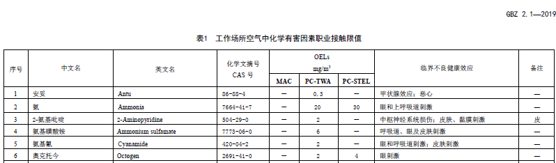 图4 GBZ 2.1-2019工作场所空气中化学有害因素职业接触限值表