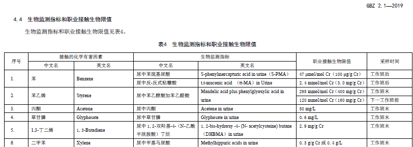图5 GBZ 2.1-2019生物监测指标和职业接触生物限值表