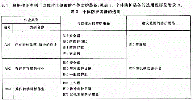 防护设备的选取首先需要企业确认生产场所的作业类别,例如有粉尘产生的作业、高温作业、易燃易爆场所作业等,然后结合产品的危险特性,例如易挥发、与水反应等,对应GB/T 11651-2008中个体防护装备的选用表格,选取对应的防护设备。