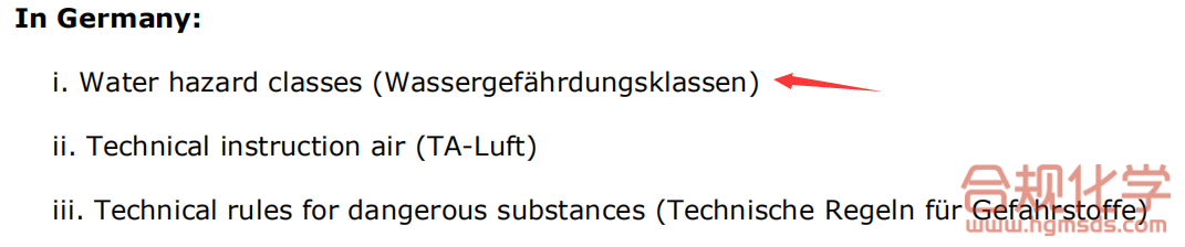 根据EU REACH法规有关SDS编写的要求,化学品SDS第15部分需要体现相关成员国的监管要求,其中德国的要求如图1所示,WGK值就是其中一项技术要求。