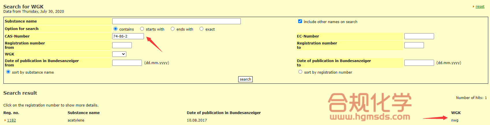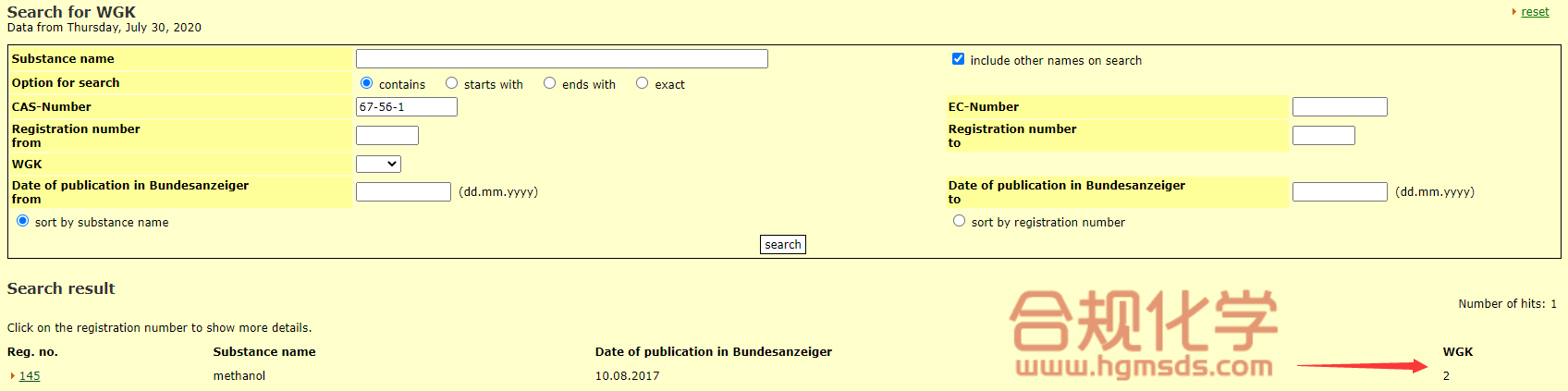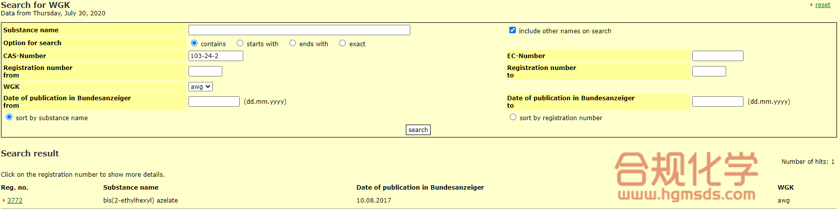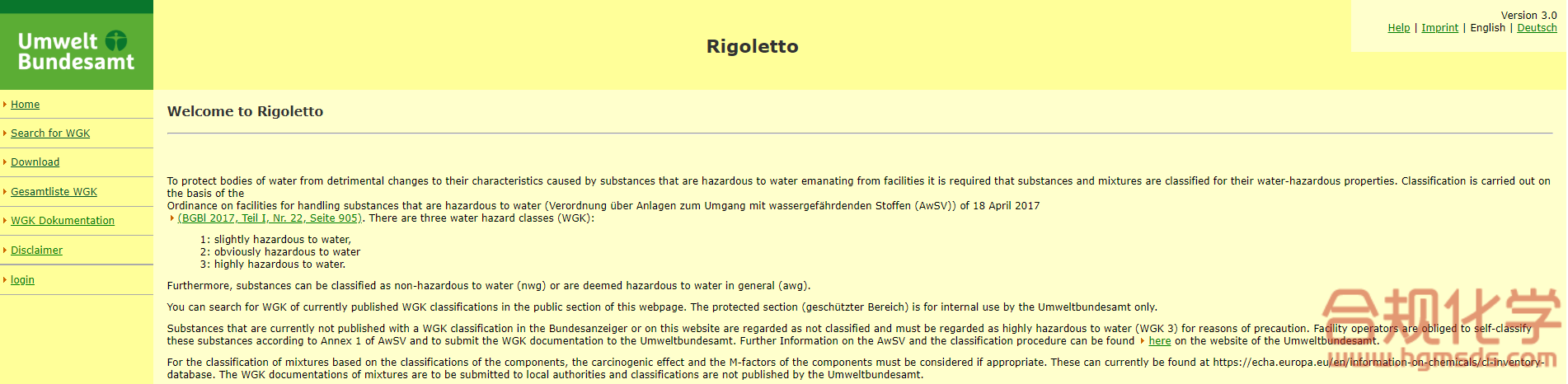 为了方便企业确定物质的AwSV危害分类以及WGK类别,德国官方提供了网络检索平台,大概含有8700多个常见化学品,具体步骤如下: