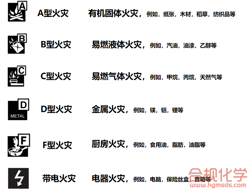 在BS EN 3标准中,火灾根据起火源种类的不同,被分为6大类,具体如图1所示。