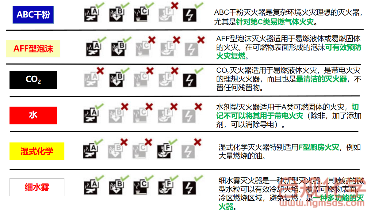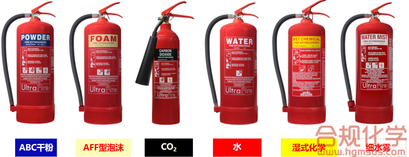 如图2所示,6种灭火器中有我们大家比较熟悉的,水剂、二氧化碳,干粉以及泡沫灭火器外,还有湿式化学(wet chemical)灭火器和细水雾(water mist)两种比较特殊的灭火器。