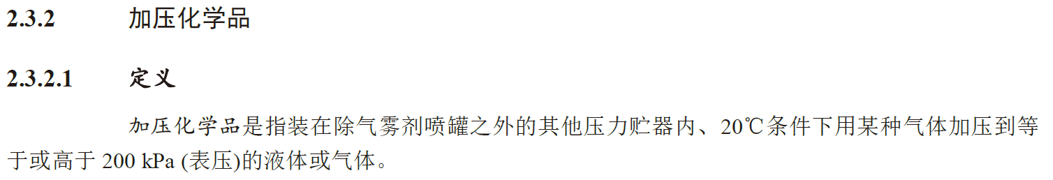 加压化学品通常含有50%及以上的液体或固体,而且如果气体含量超过50% 以上,按照GHS制度的规定,需划入高压气体(第2.5章)。