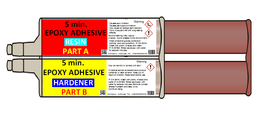 对于由两部分组成的危险货物,另一类最为常见的货物就是AB胶粘合剂,此类胶粘剂是成套销售的,由两种混合物组成,即环氧树脂(A部分)和硬化剂(B部分)。 两种混合物分别放在单独的容器中,这些容器固定在一起,并作为试剂盒在透明外包装中出售。当使用时,两个容器的内容物在挤出后或挤出过程中混合。A部分和B部分反应生成最终混合物,可用作多种材料的粘合剂。在这种情况下,需要在容器上粘贴两个单独的GHS标签,如图2。